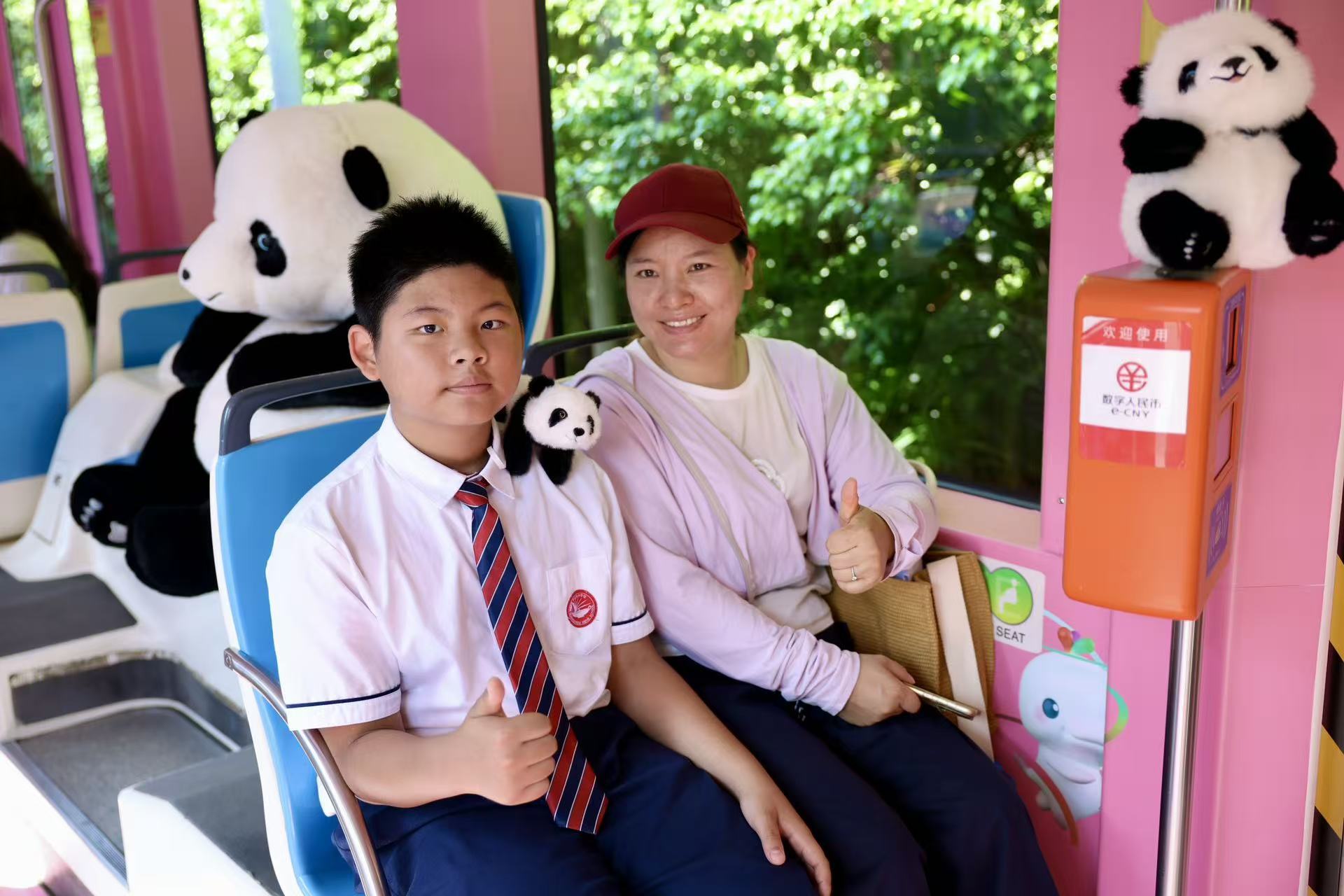 走进车厢内部,同样充满惊喜:四只大熊猫组团“出镜”,上车刷卡处摆放全运会吉祥物与熊猫玩偶,更有约1米高的熊猫打卡模型,营造出浓厚的“国宝迎全运”互动氛围。