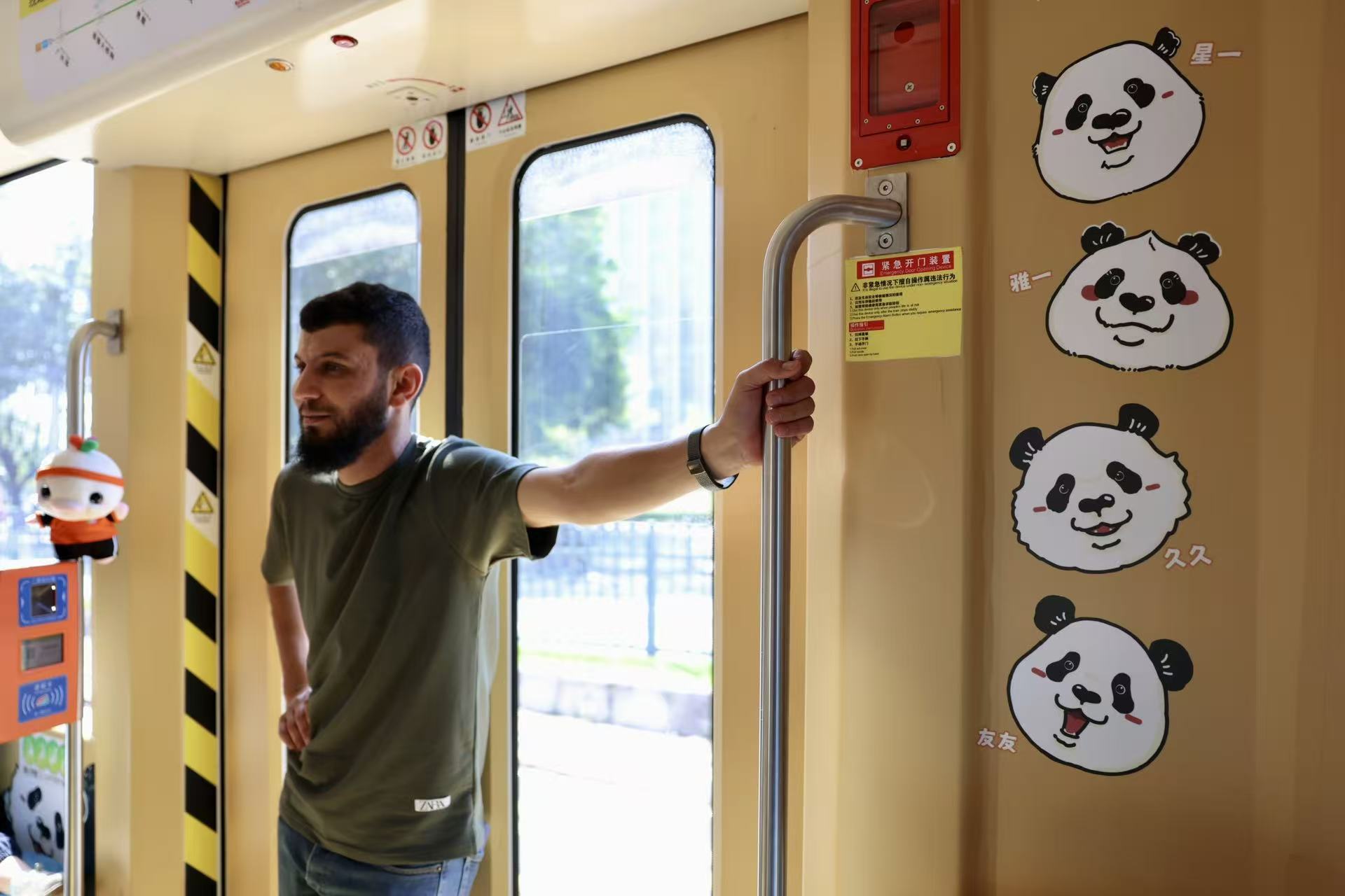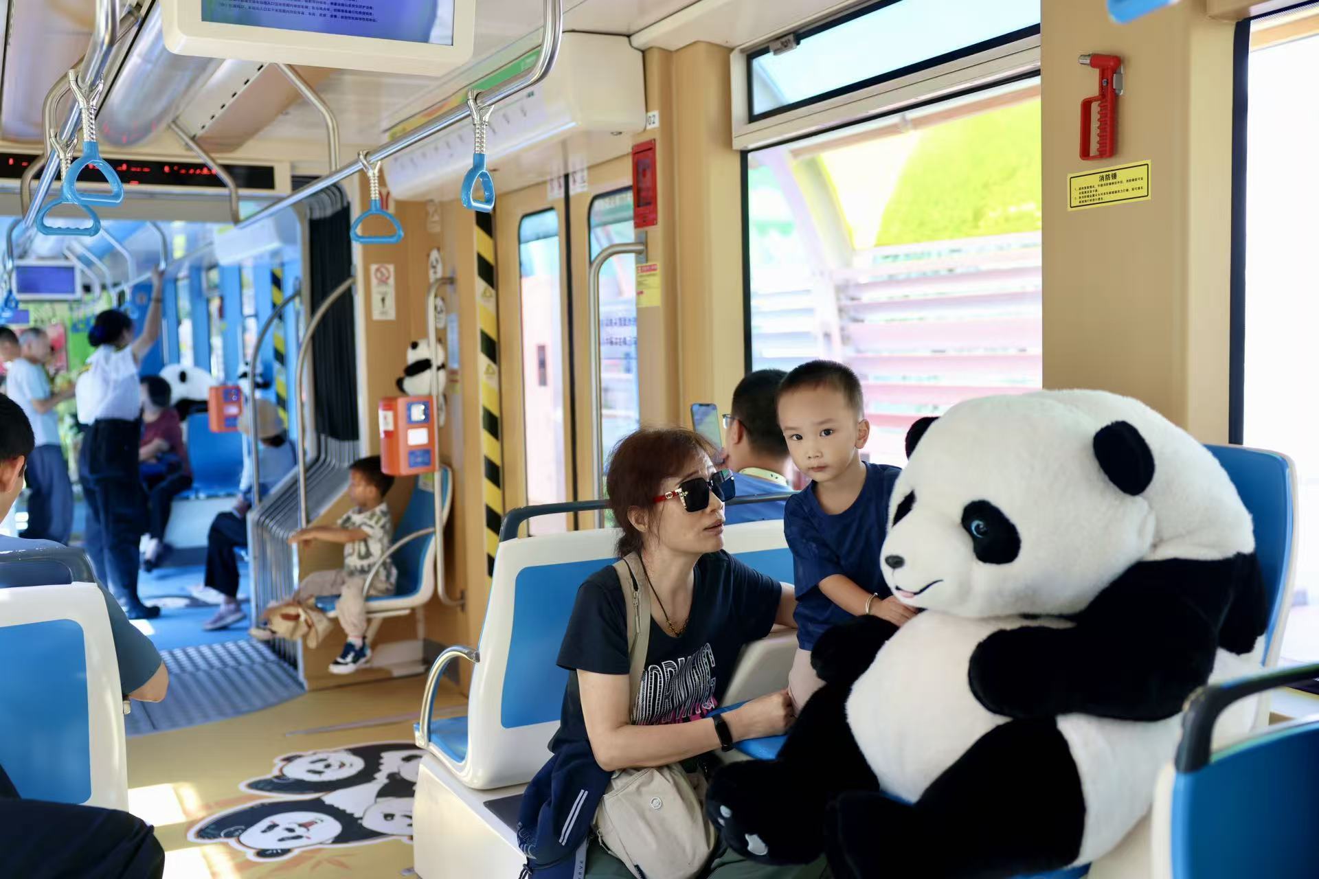 车厢外饰,不仅展示每只大熊猫的“名场面”,更特别设计了它们与全运会吉祥物“喜洋洋”“乐融融”一同参与体育竞赛的趣味绘画,“雅一”自由体操、“星一”奔跑踢球、“久久”挑战举重、“友友”则化身游泳选手,将国宝的魅力与运动的快乐传递给每一位乘客。